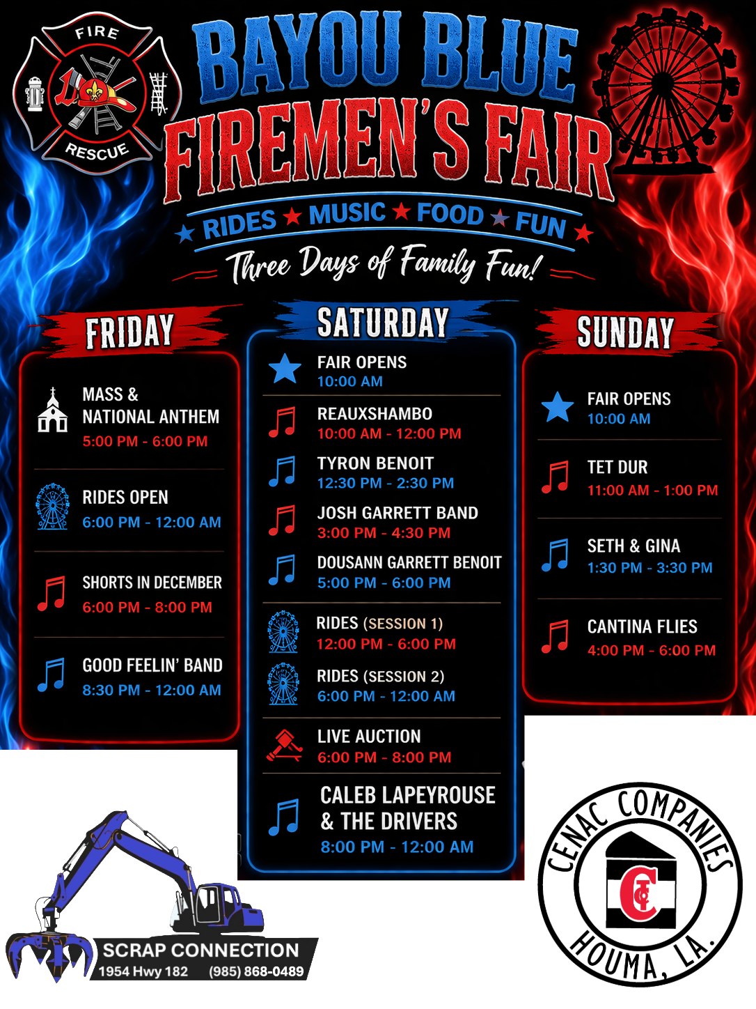 Join us for the 2nd Annual Bayou Blue Firemen's Fair! Celebrate the men and women who protect Bayou Blue with a full weekend of live music, Cajun food, carnival rides, and more! Admission is FREE.