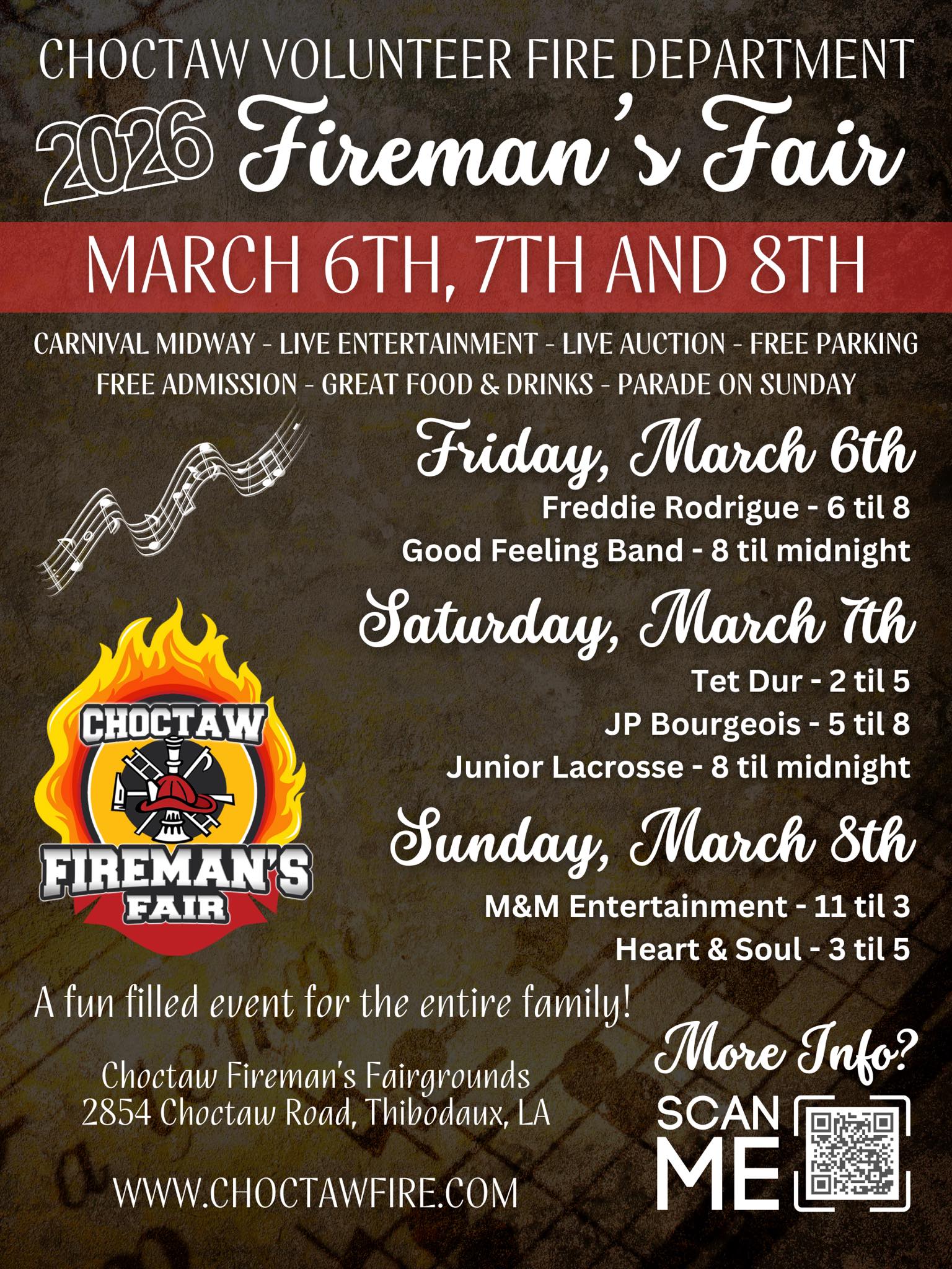 Thrown by the Choctaw Volunteer Fire Department, the Fireman's Fair is a fun 3-day celebration for the whole family. Enjoy live music, great Cajun food, amusement rides, a live auction, and a parade on Sunday.