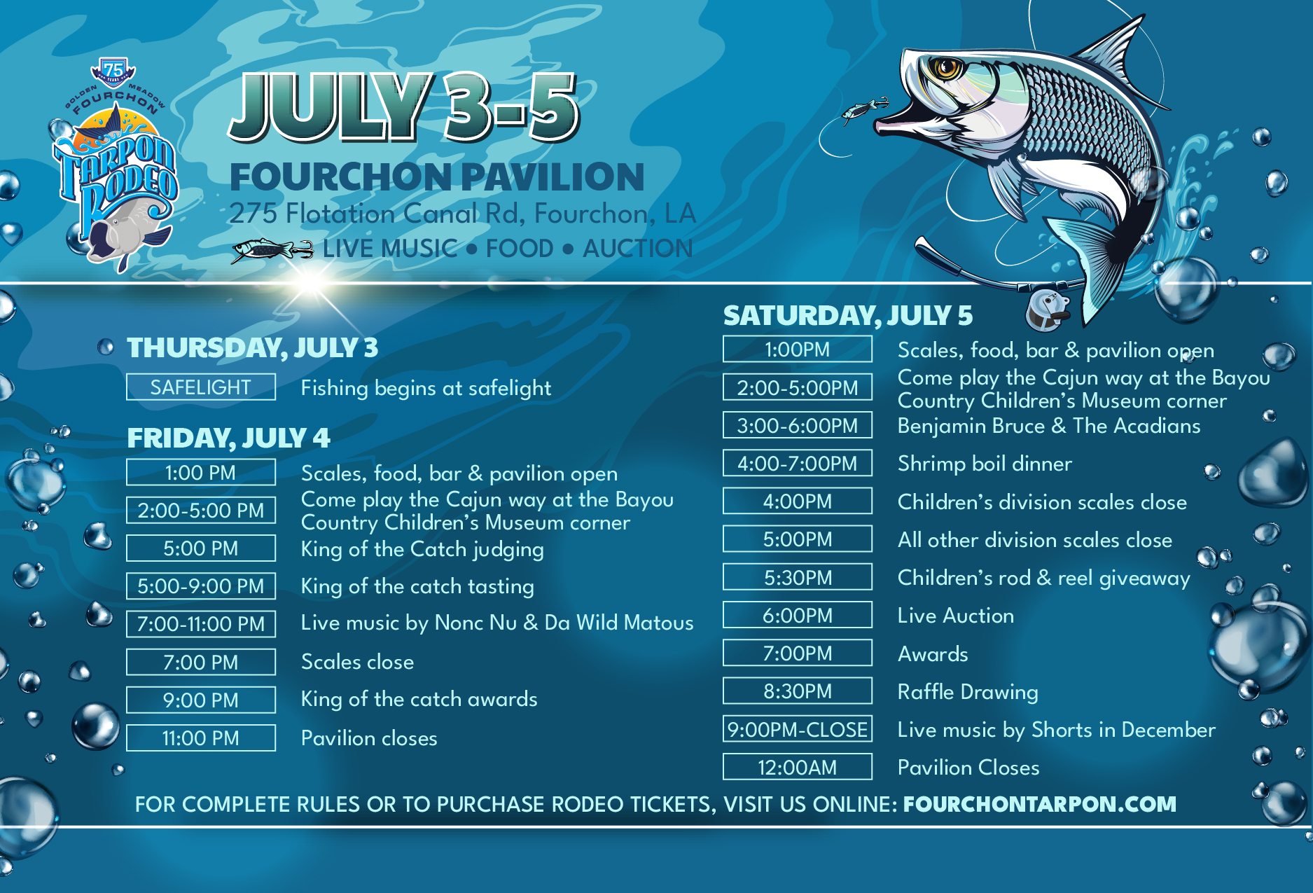 It's the 75th Anniversary of the Golden Meadow-Fourchon Tarpon Rodeo! Join us for the ultimate fishing rodeo in Port Fourchon, Louisiana! The Tarpon Rodeo features the prestigious fishing tournament, live music, a King of the Catch Cook Off, auction, and more! This is a family friendly event, so come spend the weekend soaking up the sun and good vibes!