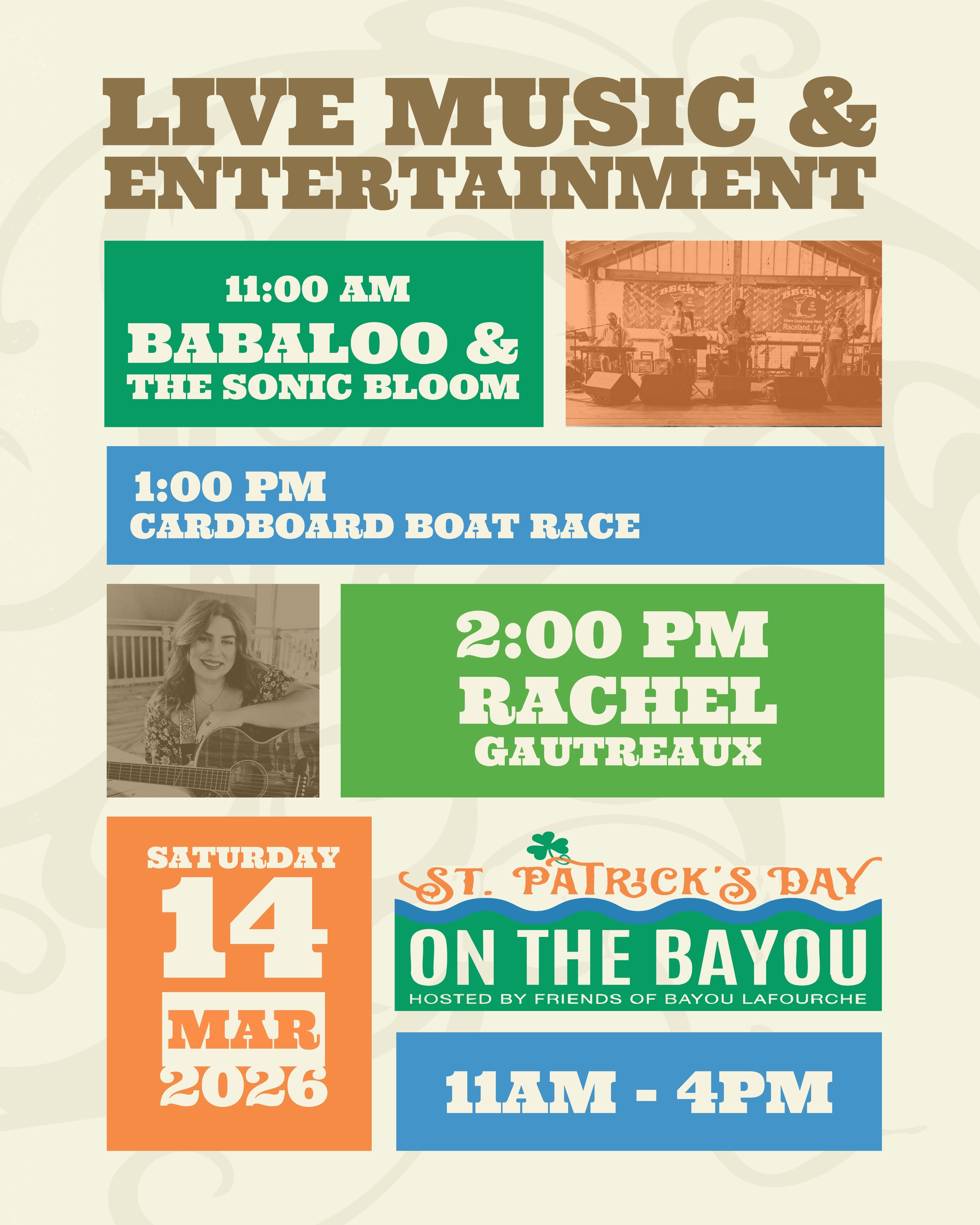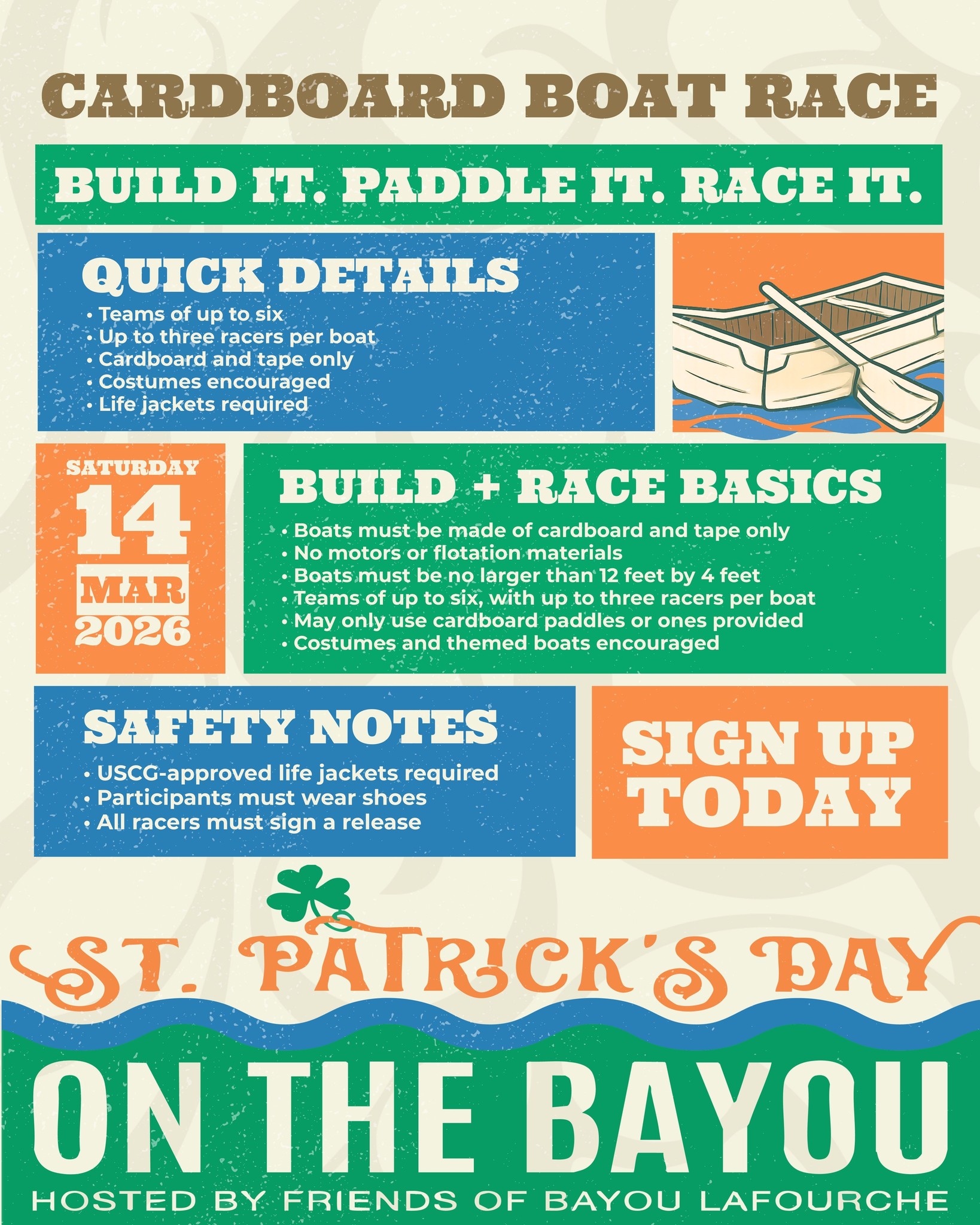 Don't forget about everyone's favorite: the cardboard boat races in the bayou! Whose boat will float? Whose will sink? Find out on March 14th!