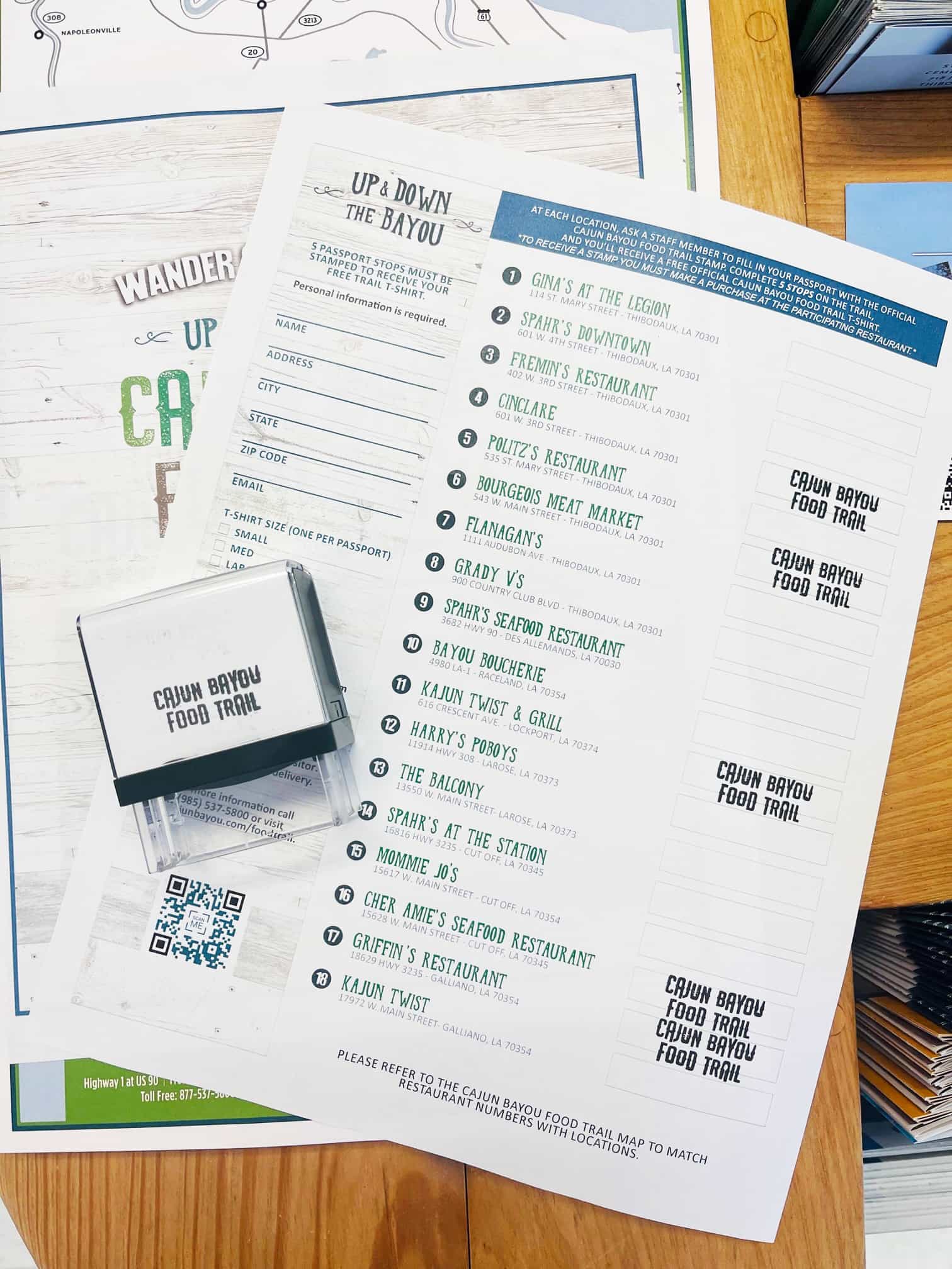 Begin your journey by picking up one of our Cajun Bayou Food Trail (CBFT) Maps & Passports at our Visitor’s Center in Raceland. This will provide you with an inside scoop on the best locally-owned Cajun restaurants. It is also the key to a free CBFT T-Shirt once you’ve stopped at 5 restaurants on the trail.