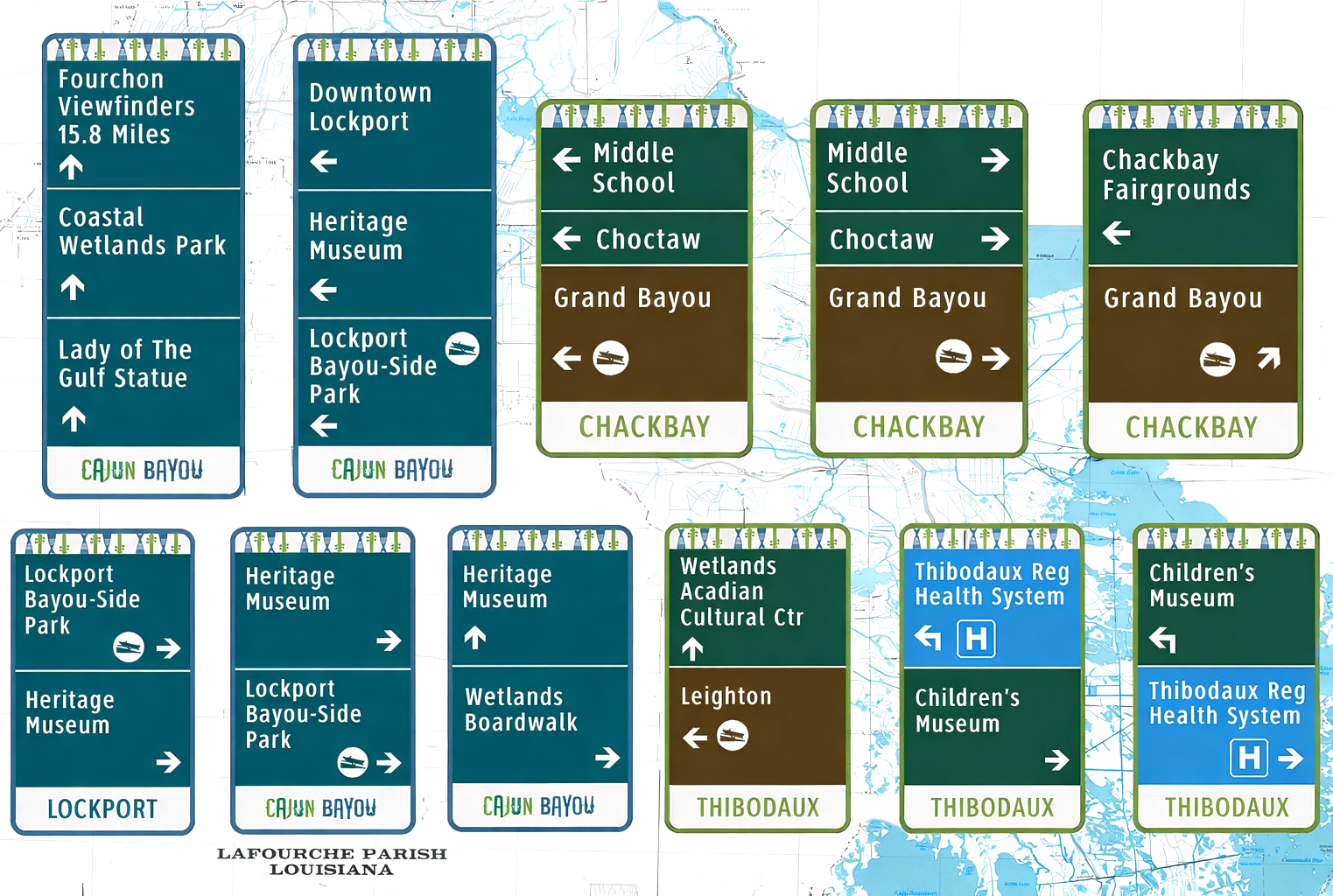The new signs will guide travelers to every city and town in Lafourche Parish while directing both visitors and residents to major tourist attractions, historical sites, boat launches, fairgrounds, and sports parks. In addition, each sign will be color coordinated directly with the exhibits inside the newly opened Visitor Center in Raceland creating a unified signage system.